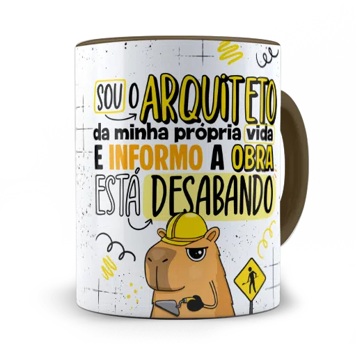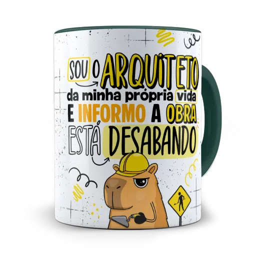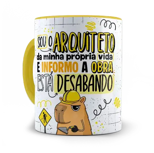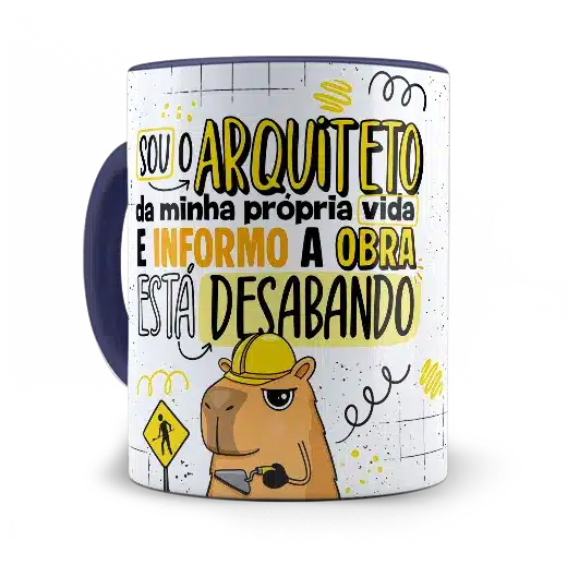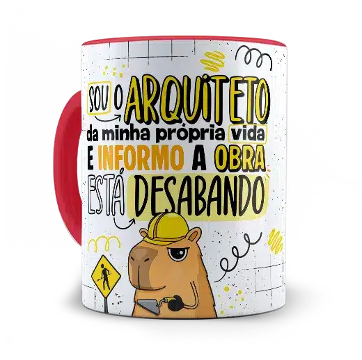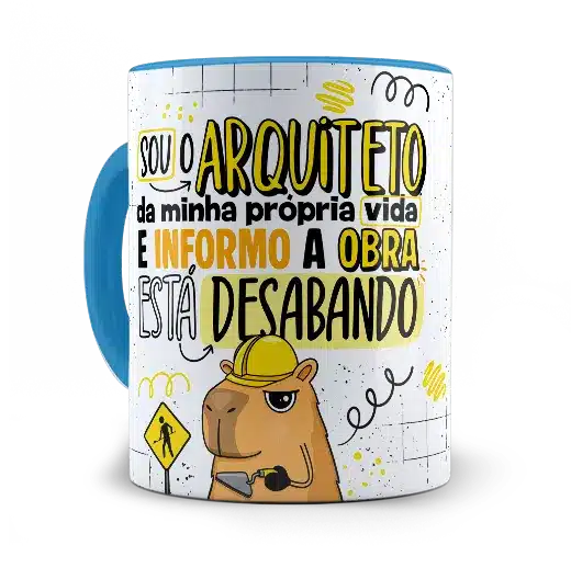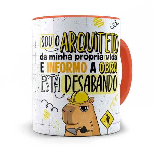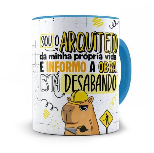 A arte em alta definição traz uma capivara com capacete e expressão de quem já aceitou que a obra não vai ficar pronta tão cedo. As cores vibrantes e o traço bem marcado garantem um visual divertido e autêntico. Você também pode escolher a cor da alça e do interior para dar ainda mais personalidade à sua caneca.