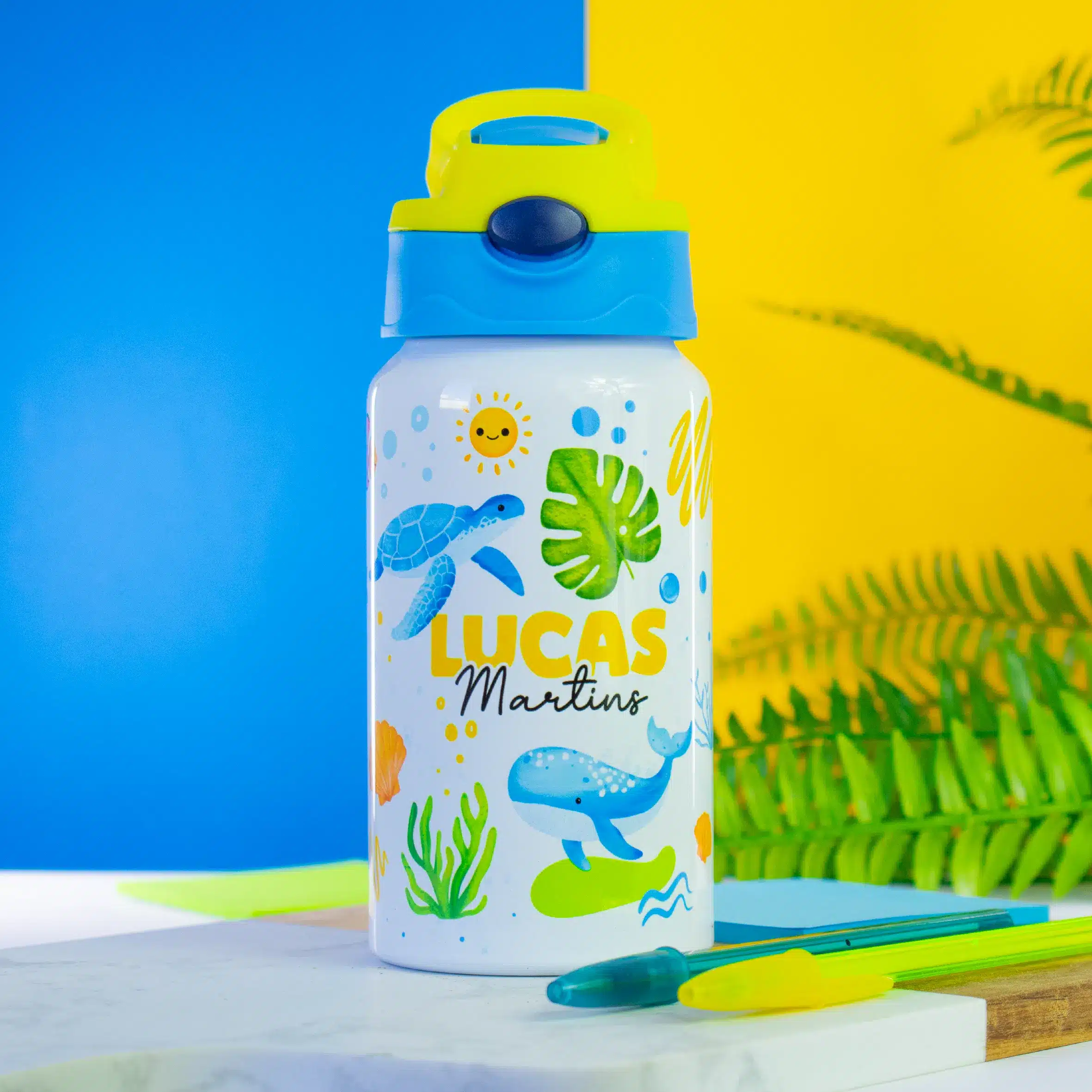 Ao mesmo tempo, o tema fundo do mar desperta a imaginação com elementos marinhos cheios de cor e diversão. Por isso, a garrafa transforma o momento da hidratação em uma experiência mais alegre e envolvente para a criança.