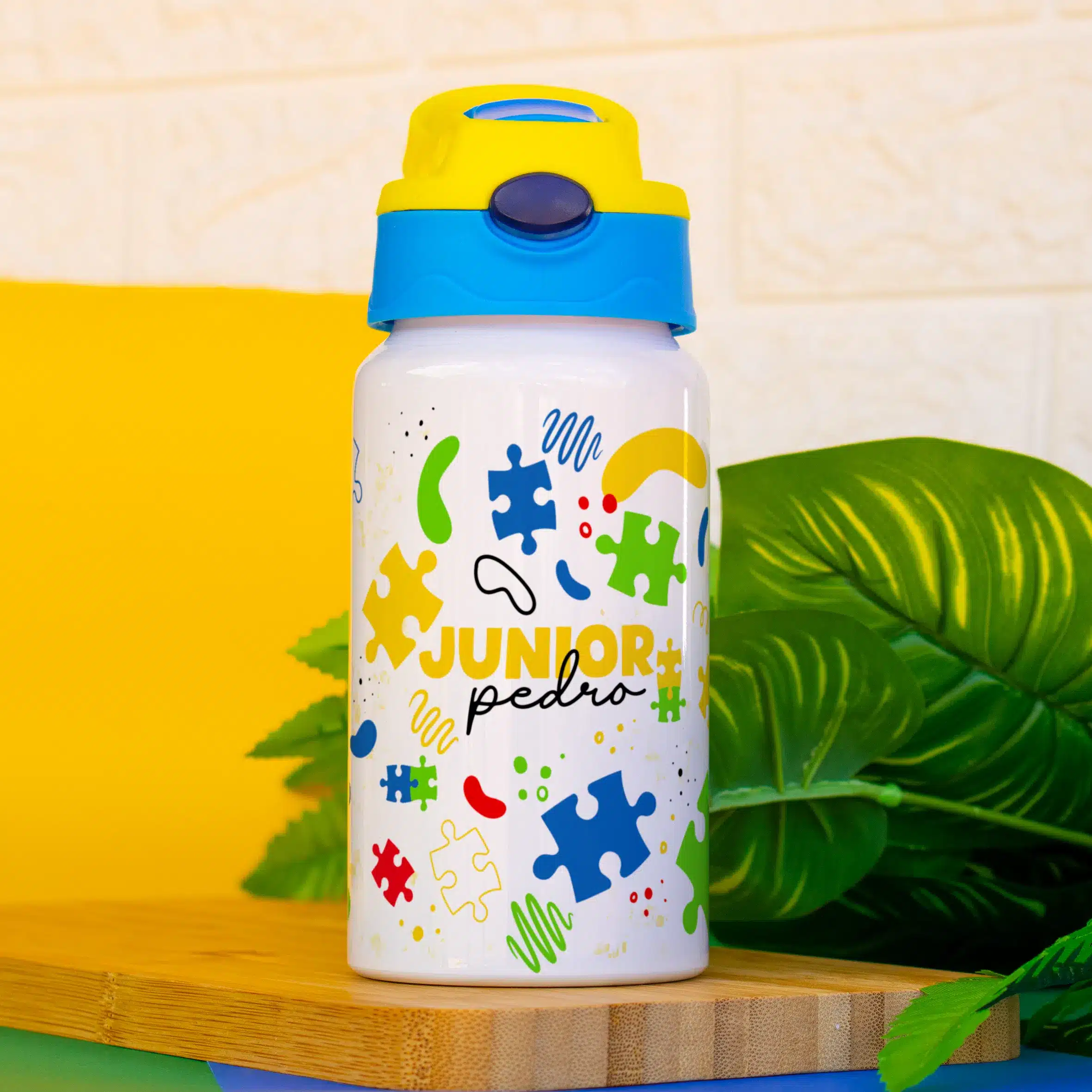 Ao mesmo tempo, o tema quebra-cabeça traz um visual lúdico, colorido e educativo. Por isso, a garrafa transforma o momento da hidratação em algo mais leve, divertido e estimulante.